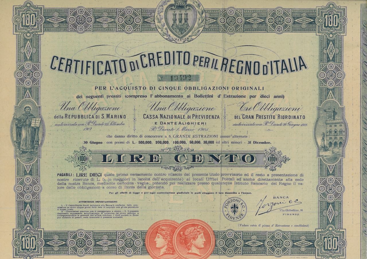 A-16979Certificato di Credito per il Regno d’Italia per l’Acq. di 5 Obblig.-1Firenze1907100 lireVerdeR8 (11-25 pezzi)S5 (da 251 a 500 €)