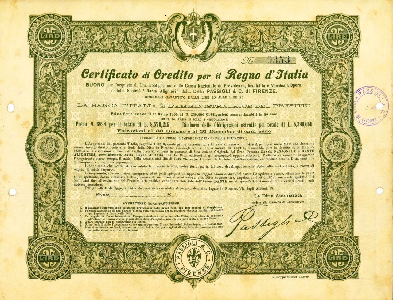 Certificato di credito privato emesso dalla Ditta Passigli & C. di Firenze, autorizzata alla distribuzione al pubblico di obbligazioni di rendita dello Stato italiano con premi, in collaborazione con la Società Dante Alighieri e con la Banca d’Italia quale amministratrice del prestito.