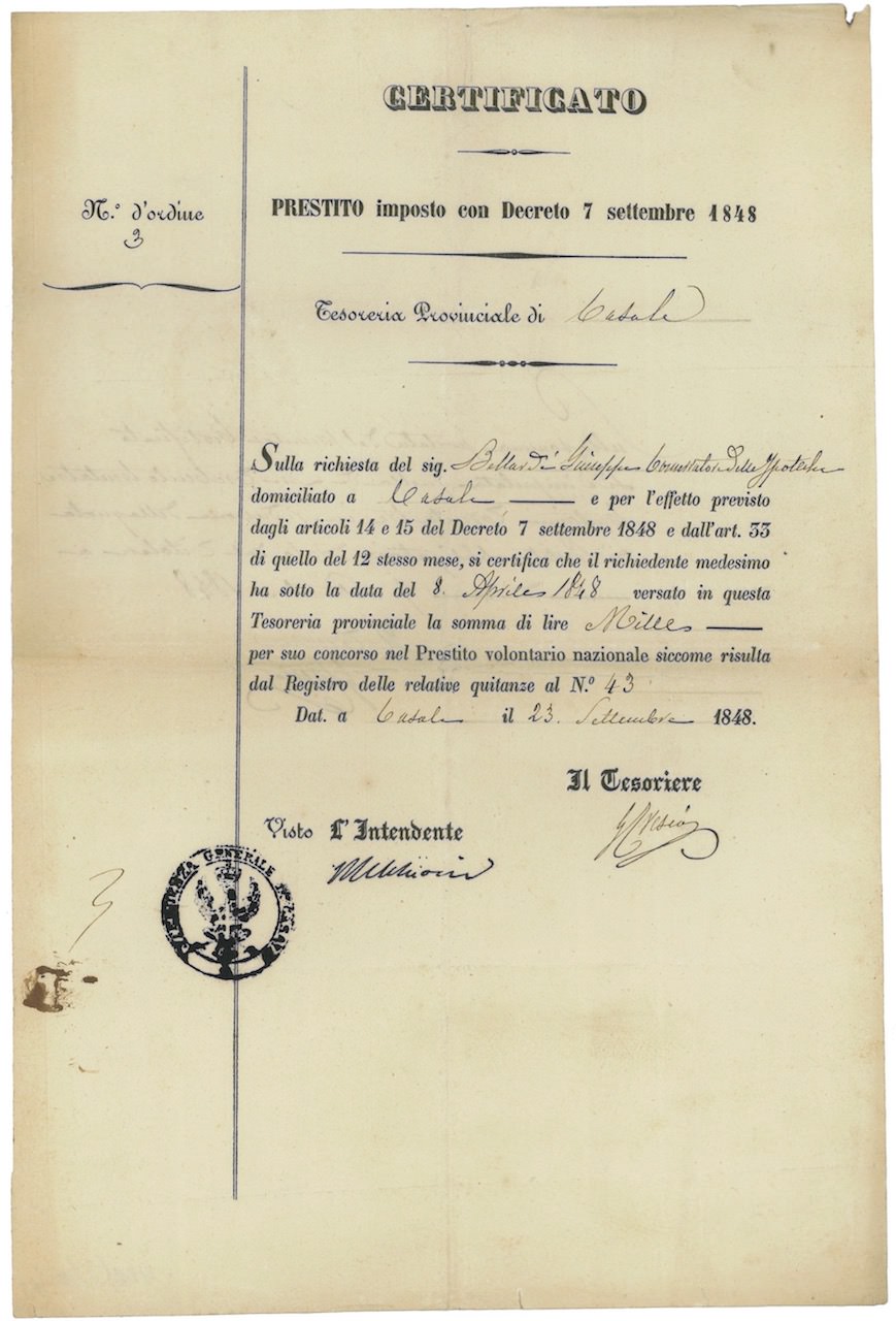 Certificato Prestito Imposto con Decr. 7 Settembre 1848