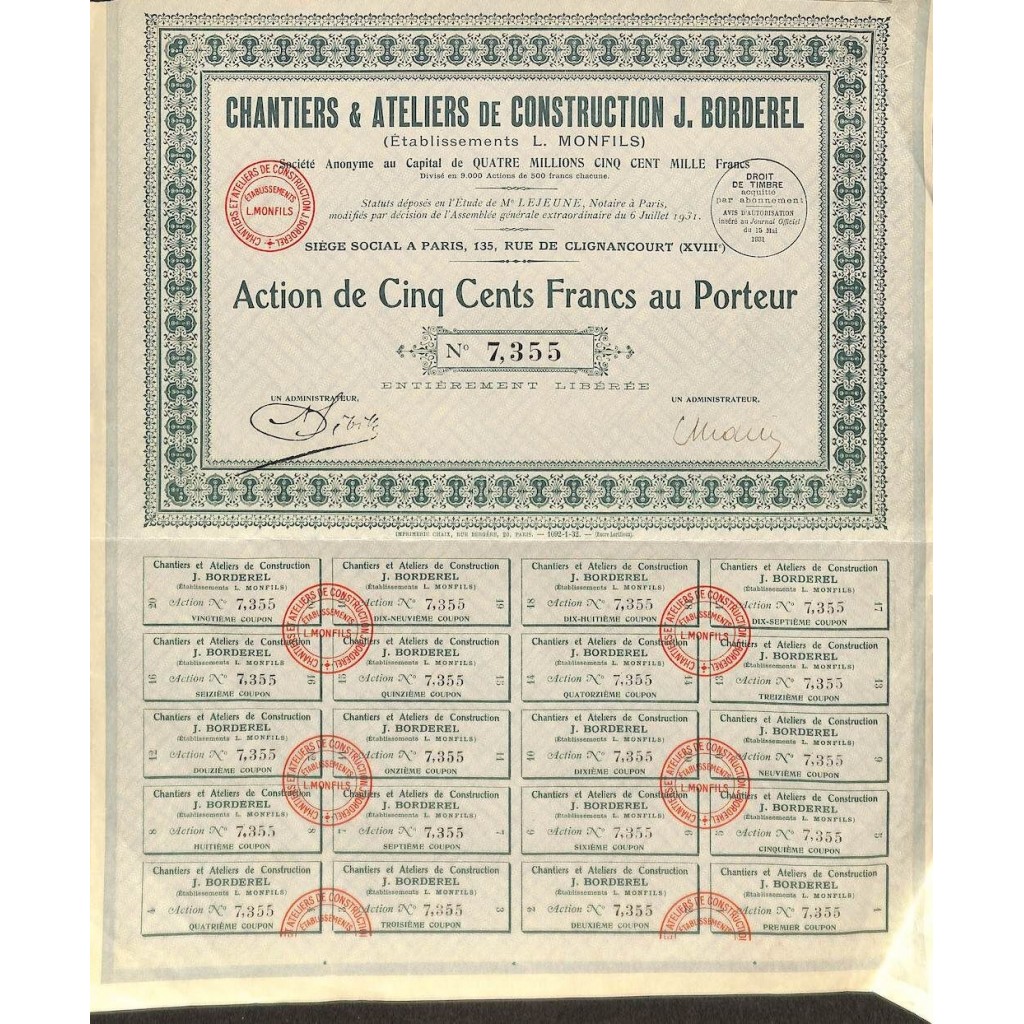 A-51885Chantiers et ateliers de construction j. Borderel-1 Parigi1931500 FranchiR1 (Più di 5000 pezzi)S1 (da 0 a 25 €)