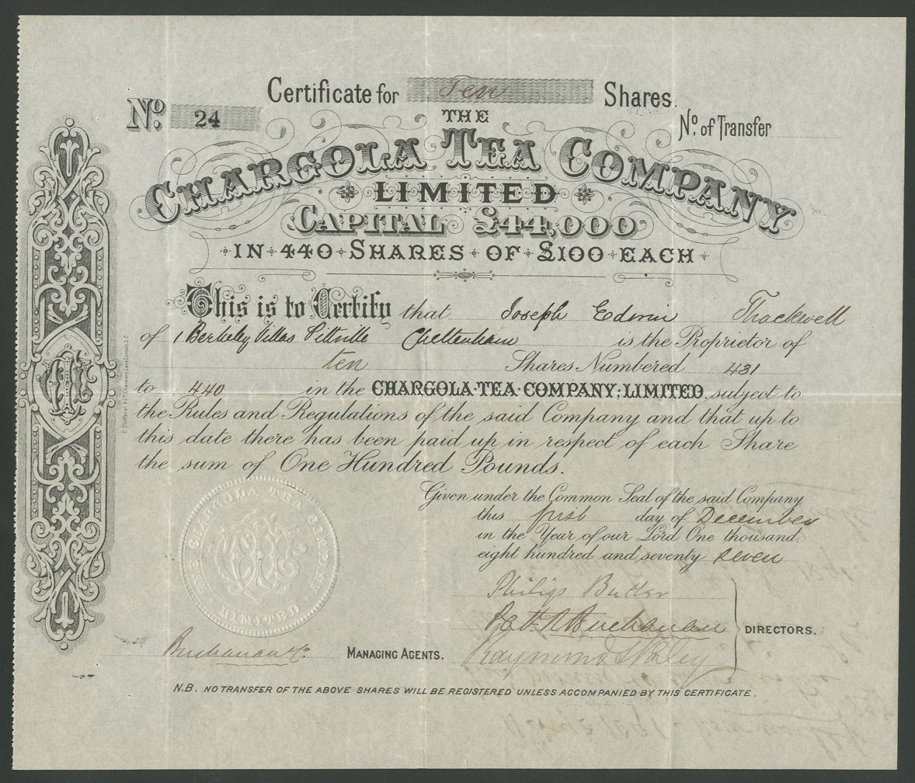 Capitale £ 44.000 in 440 azioni da £ 100.