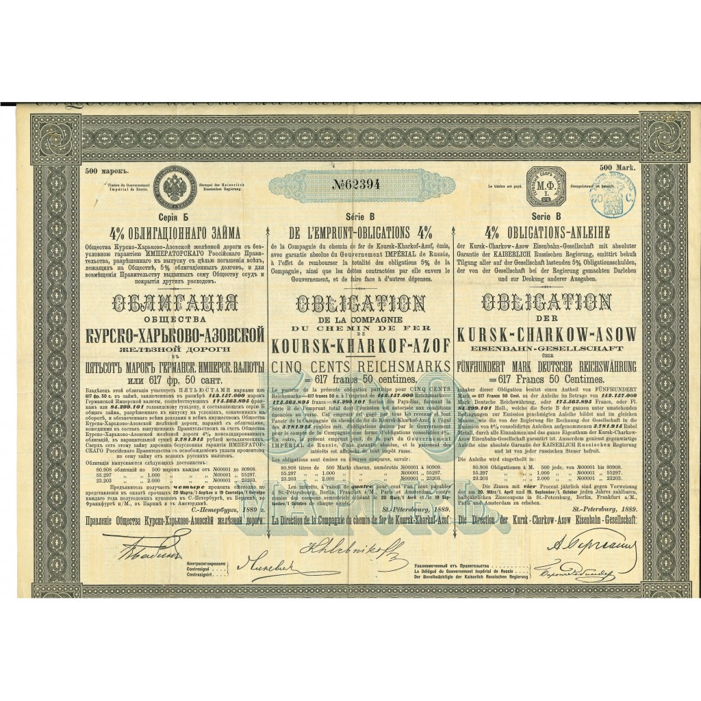 Obligation 4 % Série B de 500 Mrk ou 617F – St-Pétersbourg 1889