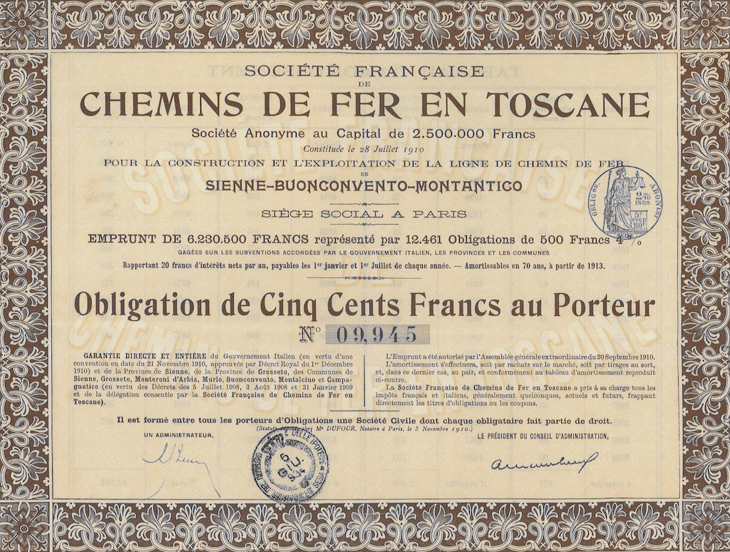 A-5008Chemins de Fer en Toscane Soc. Francaise de (Linea Siena-Buonconvento-Montalcino)-1Imprimerie Chaix – ParisSiena19101 obbligazione 4%R2 (1001-5000 pezzi)S3 (da 51 a 100 €)