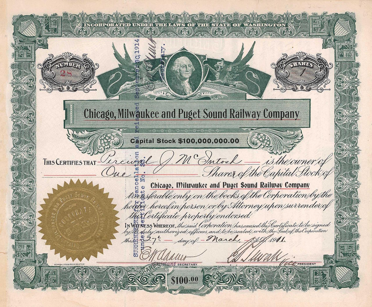 Fondata nel 1863 come Milwaukee & St. Paul Railway, divisa in 4 società di costruzioni ferroviarie negli stati del South Dakota, Montana, Idaho e Washington. Rinominato nel 1908 come sopra. La linea ferroviaria più lunga costruita da questa società (Mobridge, S.D. – Maple Valley, Wash.) era lunga 1.347 miglia.