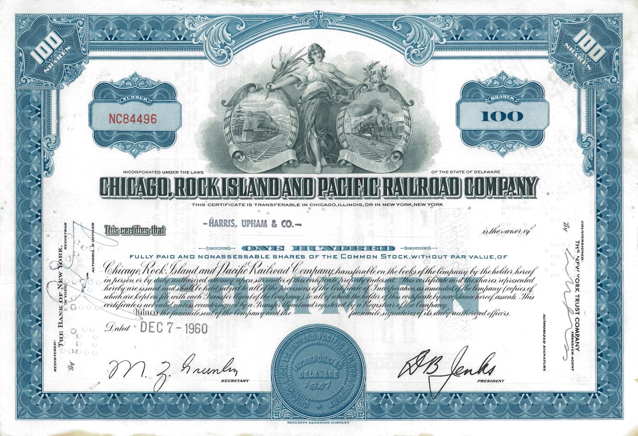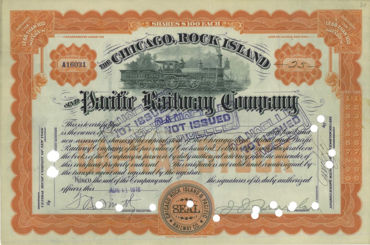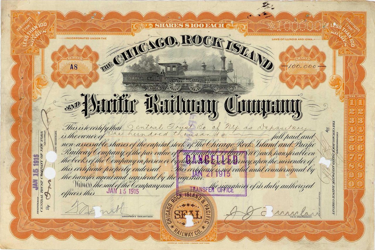 Fondata nel 1866 dalla fusione della Chicago & Rock Island RR (Illiois a sinistra del Mississippi, fondata nel 1851) e della Mississippi & Missouri RR (Iowa a destra del Mississippi, fondata nel 1852). Il cuore della linea principale di 500 miglia da Chicago, Illinois. A Council Bluffs, Ia. (500 miglia) era il ponte sul Mississippi vicino a Rock Island, costruito a partire dal 1854 e sostituito nel 1868/69, in parte a spese dello Stato, da una struttura in ferro. Nel 1880-91 la rete di rotte crebbe attraverso fusioni e acquisizioni fino a quasi 4.000 miglia e ora si estendeva agli stati di Kansas, Indiana, Nebraska e Colorado.