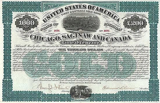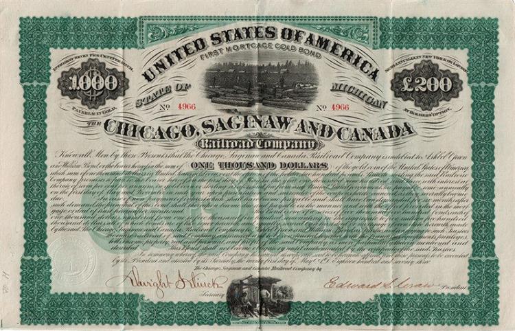 Il certificato, stampato dalla National Bank Note Co. di New York, è avvalorato da belle vignette che riproducono il taglio di un bosco ed una segheria da campo. La società ferroviaria fu fondata nello Stato del Michigan nel 1873 e lanciò tale prestito per finanziare la costruzione della linea per congiungere Illinois, Michigan e Canada. Già nel 1876 fu costretta a dichiarare bancarotta. Rimase tuttavia in vita fino al 1883, quando fu incorporata nella Saginaw and Western Railroad.