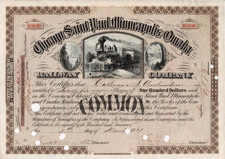 A-53835Chicago, Saint Paul, Minneapolis and Omaha Railway Company-1New York192125 azioni comuni da 100 $R3 (501-1000 pezzi)S2 (da 26 a 50 €)