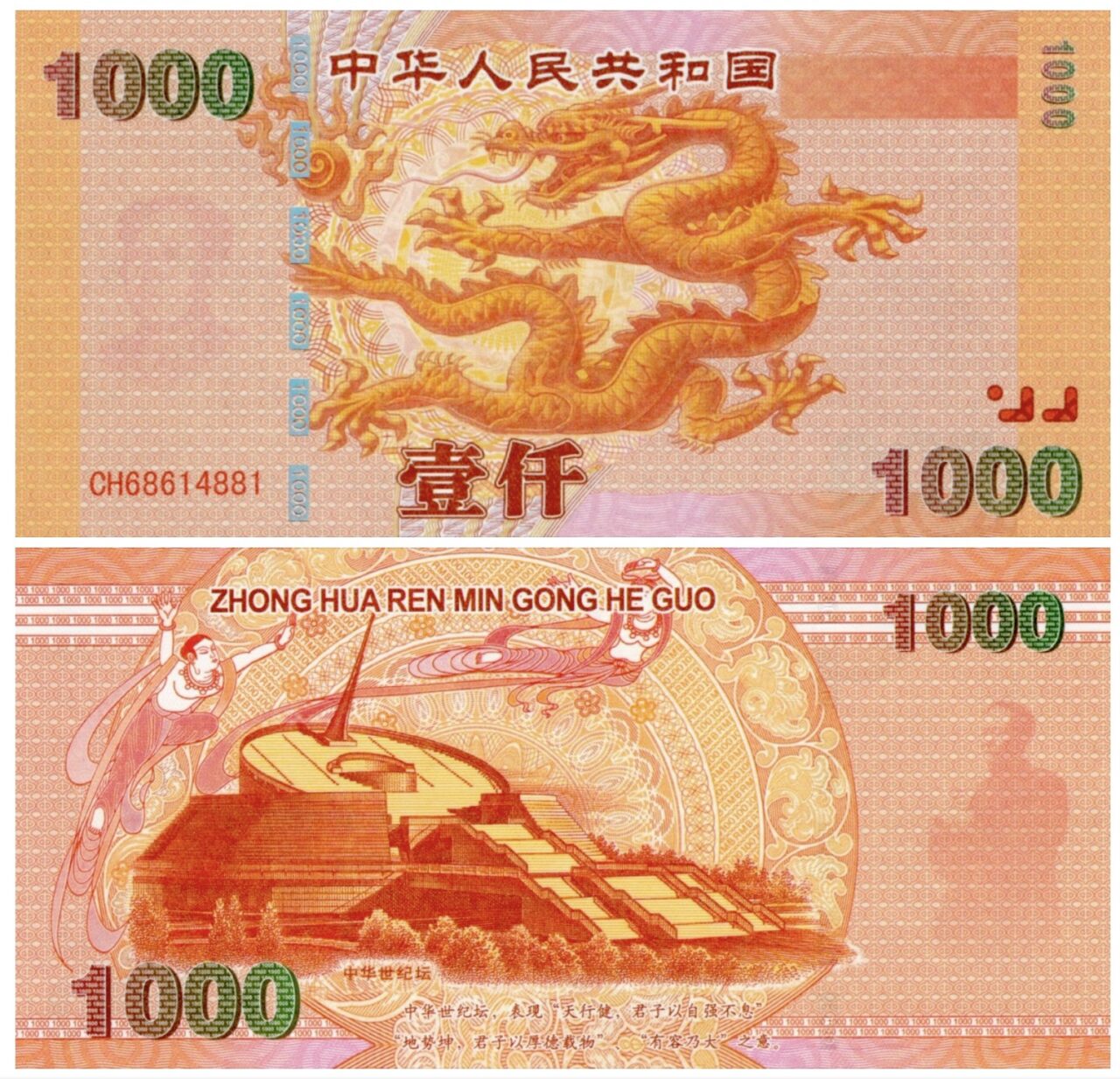 The “Millennium” 1.000 Yuan commemorative for education r. note. Issued in the year 2000 to commemorate the new millenium. Decipted on the front is the Dragon at the Nine Dragons Wall at the imperial Palace in Beijing. Decipted on the back is the China Millennium Monument, at the Center for Cultural and Scientific Fairs and flying “Apsaras” (cloud girls. Material: Paper)