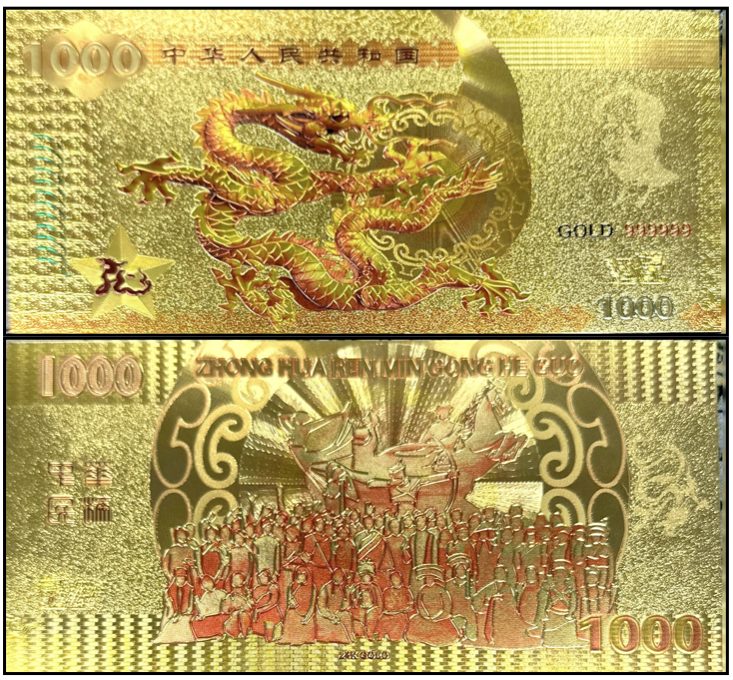 Attenzione: Sono state stampate a scopo promozionale anche delle banconote (fun banknotes) Gold con taglio 1.000 Yuan Con filigrana luminosa di sicurezza. (with security watermark light have no legal value and were not issued by the Bank).