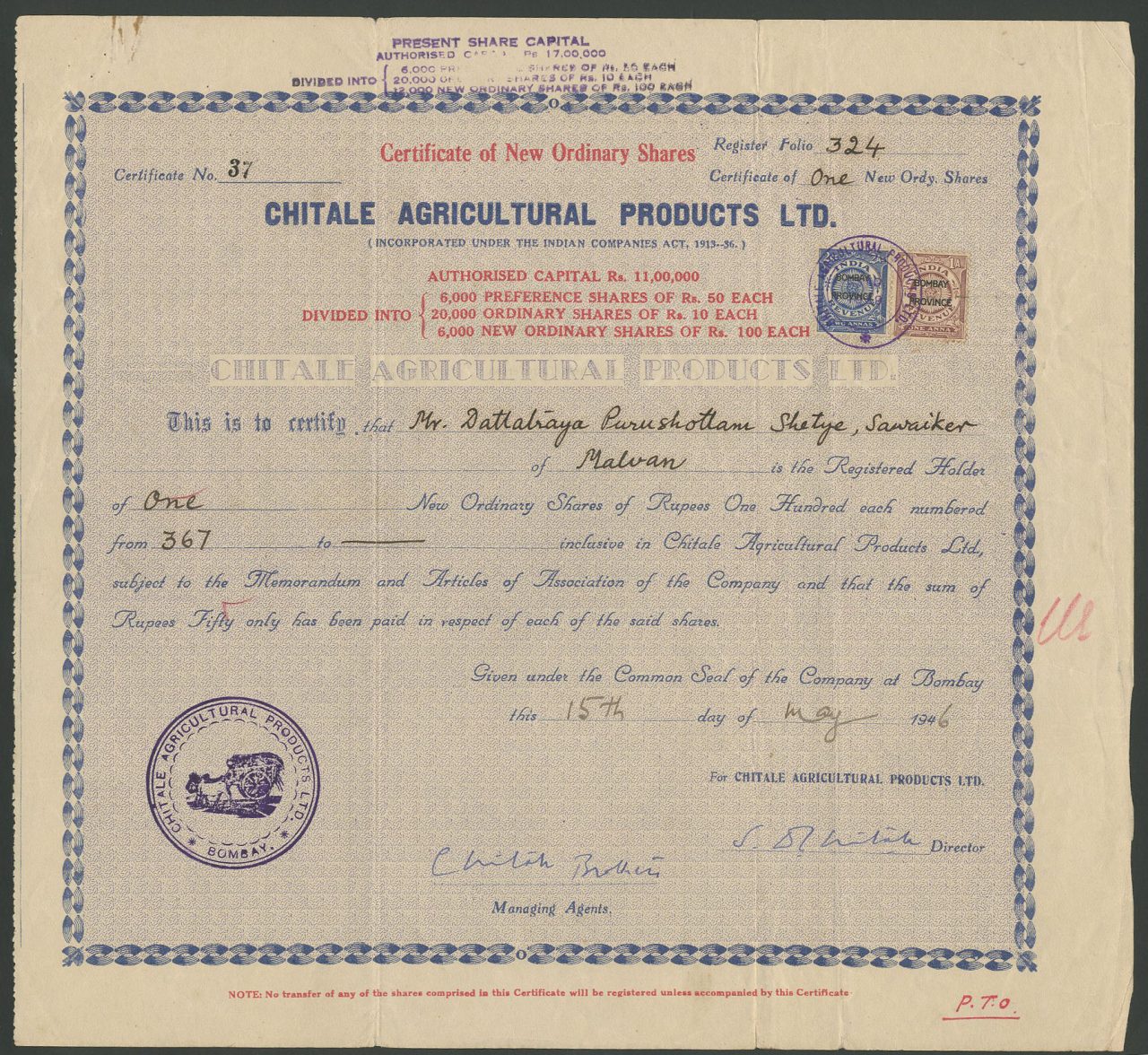 Capitale 11.00.000 rupie in 20.000 azioni ordinarie da 10 rupie, 6.000 azioni privilegiate da 50 rupie e 6.000 nuove azioni ordinarie da 100 rupie.