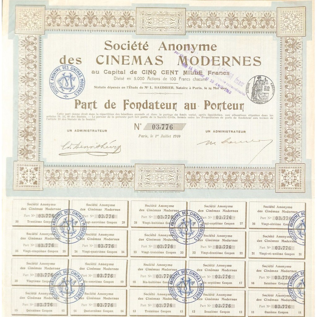 A-47128Cinemas modernes soc. Anon. Des-1Parigi1910Parte di fondazione al portatore.R1 (Più di 5000 pezzi)S1 (da 0 a 25 €)