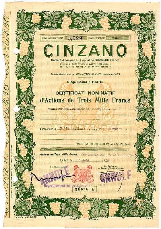 Filiale francese della “Francesco Cinzano & C.”, mitico nome nella storia enologica piemontese ed italiana. La famiglia Cinzano, di origini antiche, oltre a produrre vermouth inventò – su espressa richiesta di Casa Savoia – il metodo di spumantizzazione che rese il loro marchio famoso nel mondo. Nel 1999 la società, che continua a produrre e ad esportare vermouth e spumanti in oltre cento paesi, entrò a far parte del Gruppo Campari.