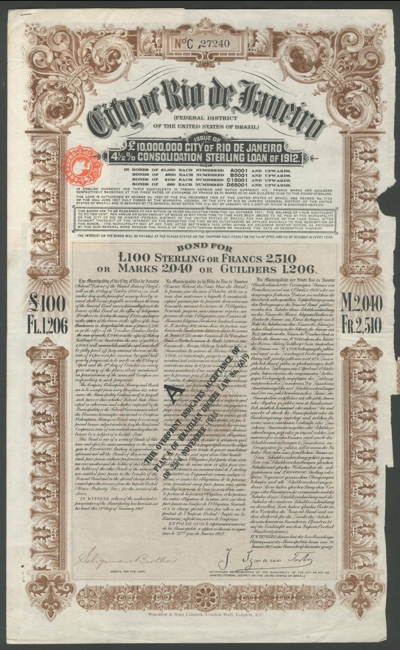 A-33610City of Rio de Janeiro, 4½% Consolidation Sterling Loan of 1912-1Brasile1912£100R3 (501-1000 pezzi)S3 (da 51 a 100 €)
