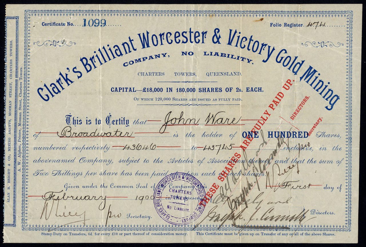 A-32027Clark’s Brilliant Worcester & Victory Gold Mining Company NL-1Queensland1900100 SharesR2 (1001-5000 pezzi)S2 (da 26 a 50 €)
