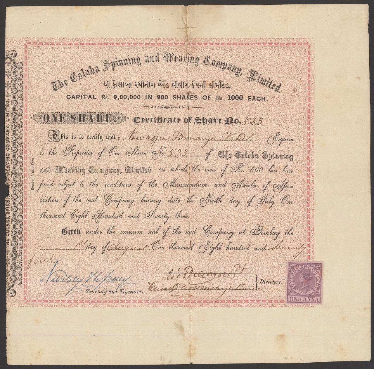 Capitale 9.00.000 in 900 azioni da 1000 rupie, aumentato dal 1876 a 15.00.000 rupie in azioni da 1000 rupie.