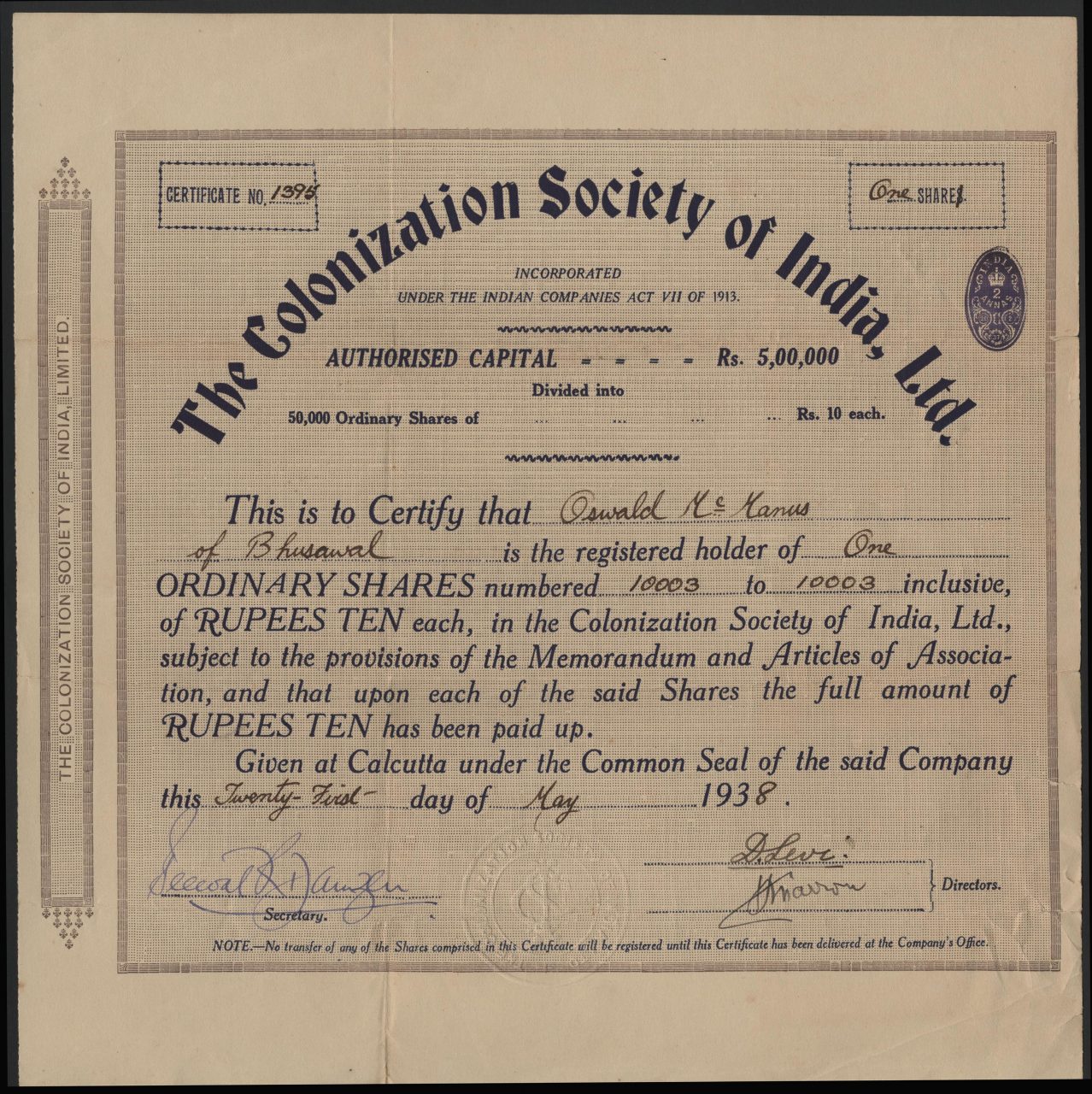 Incorporato sotto l’Indian Companies Act del 1913. Costituito per la vendita di appezzamenti di terra agli anglo-indiani nella giungla di Chottanagpur conosciuta come McCluskiegunge.