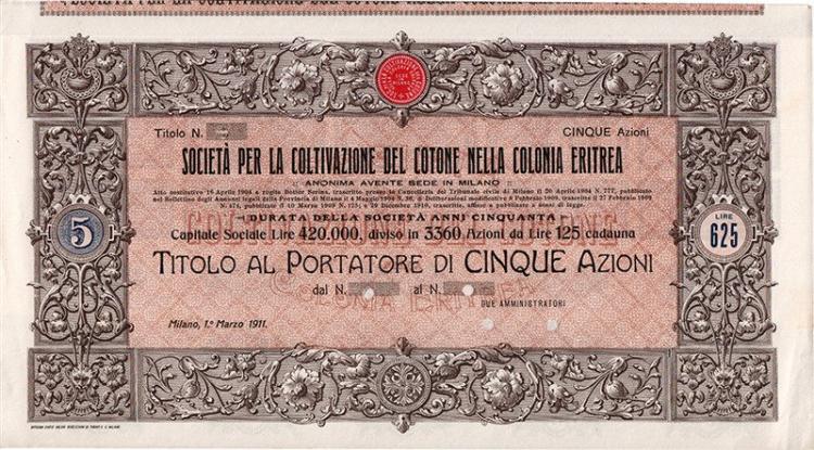 A-39347Coltivazione del Cotone nella Colonia Eritrea Soc. per la-1Milano19125 azioni al portatore da Lire 125R3 (501-1000 pezzi)S4 (da 101 a 250 €)