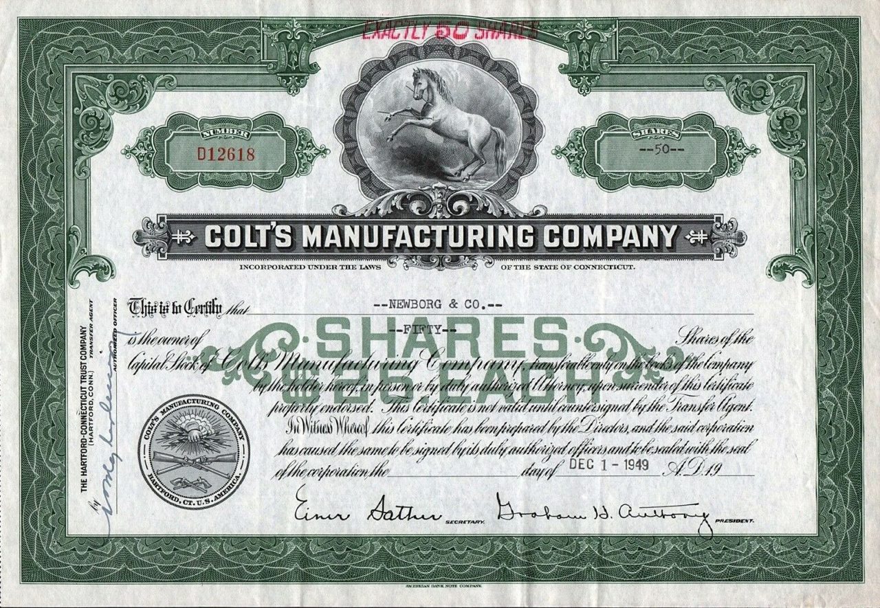 A-52930Colt’s Manufacturing Company-1Connecticut194950 azioni da 25$R2 (1001-5000 pezzi)S2 (da 26 a 50 €)