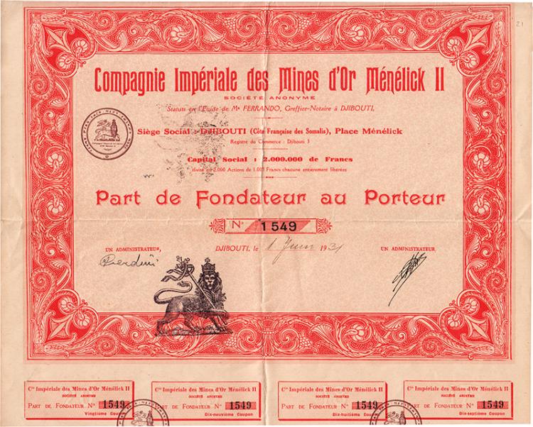 La società prese il nome dall'Imperatore d'Etiopia (Negus) Menelick II (1844-1913). Singolare timbro a inchiostro con il Leone di Giuda con corona e scettro, emblema dell’Impero Etiope.