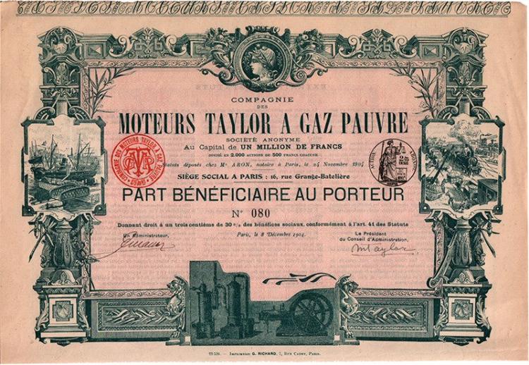 La società fu creata nel 1904 da M. Taylor (firma sul certificato come presidente) per promuovere l’applicazione industriale in vari settori - marittimo, ferroviario e altri - del motore a gas povero, da lui concepito e brevettato. Il gas povero, costituito da una miscela di monossido di carbonio, anidride carbonica, azoto e idrogeno, rappresenta un combustibile economico ma dal basso potere calorifico. Bel bordo ornamentale in cui spiccano vignette ispirate agli obiettivi sociali e l’immagine di un motore Taylor.