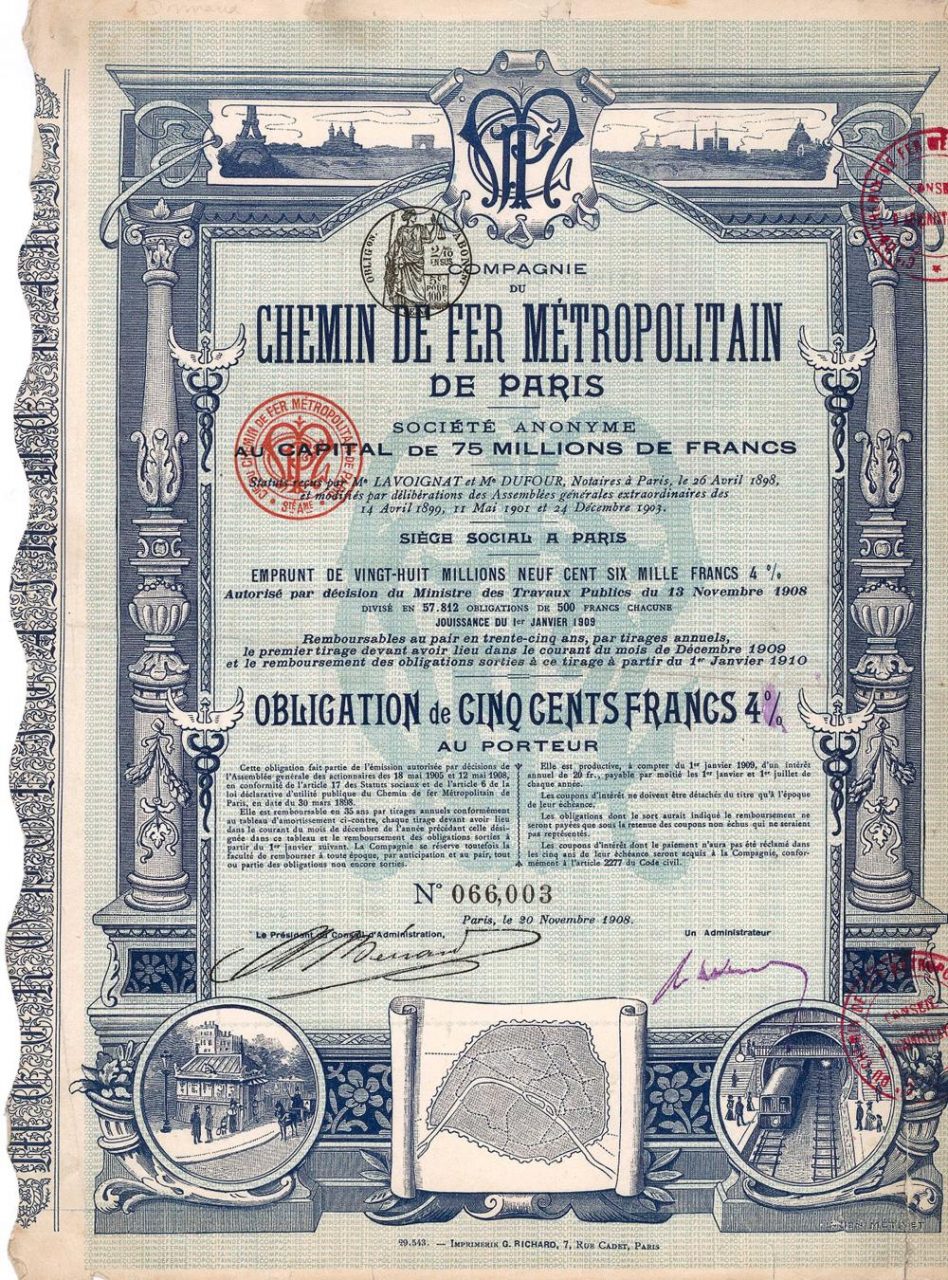 A-35839Compagnie du Chemin de Fer Métropolitain de Paris-1Parigi1908Obbligazione 4% da 500 Franchi francesiR3 (501-1000 pezzi)S3 (da 51 a 100 €)