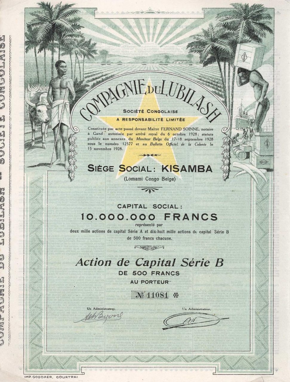 A-45330Compagnie du lubilash-1Kisamba19281 azione di capitale Serie B da 500 FranchiR4 (251-500 pezzi)S4 (da 101 a 250 €)