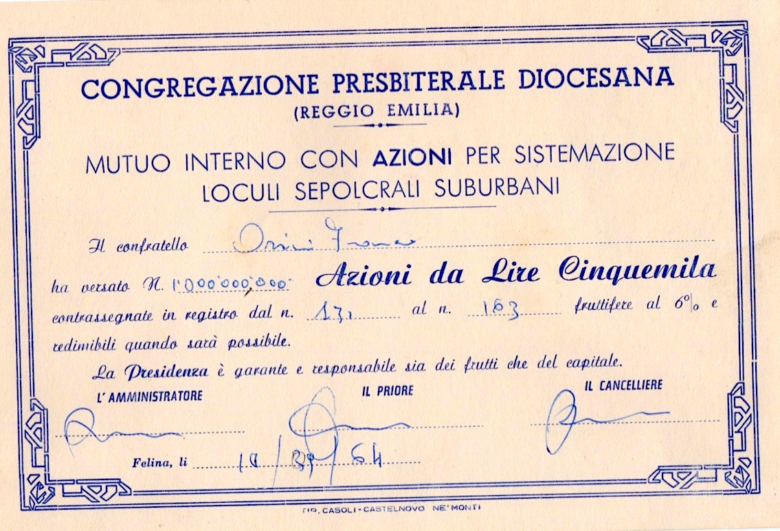 A-83349Congragazione Presbiterale Diocesana Reggio Emilia Mutuo Interno per azioni sistemazione loculi sepolcrali suburbani-1Felina1964Azioni da lire 5.000R1 (Più di 5000 pezzi)S1 (da 0 a 25 €)