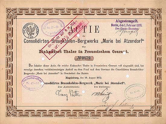 A-71289Consolidirtes Braunkohlen-Bergwerk Marie bei Atzendorf-1Magdeburgo18721 azione da 100 Talleri--