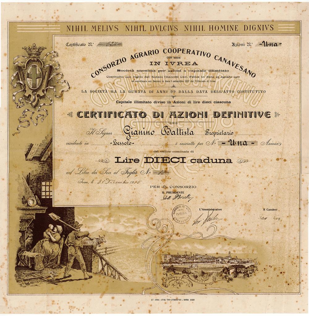 Il documento del 1915 è stato stampato dallo stabilimento Tipo-Litografico L. Garda di Ivrea. Formato grande singolare, quasi quadrato, 42×42,5 cm. Magnifica veste grafica dai sinuosi richiami Liberty: stemma comunale del capoluogo del Canavese sormontato da corona marchionale, idilliaco spaccato di vita familiare in un casolare agricolo, scorcio panoramico di Ivrea sulle sponde della Dora Baltea. In testa il motto latino tratto dal primo volume del trattato filosofico De Officiis di Cicerone: Nihil Melius Nihil Dulcius Nihil Homine Dignius ovvero Non c’è nulla di meglio, di più dilettevole e più degno per un uomo libero (dell’Agricoltura). Tra il 1910 ed 1920 in Piemonte si contavano circa 70 associazioni cooperative in esercizio, tutte iscritte alla Federazione Italiana dei Consorzi Agrari o Federconsorzi di Piacenza.