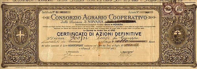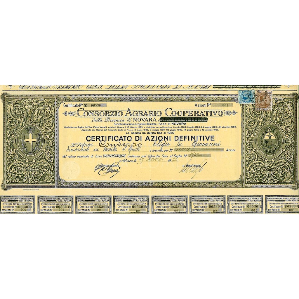 L'originaria denominazione della società, creata nel 1899, era Consorzio Agrario Cooperativo della Provincia di Novara e della Lomellina (ultima parte cancellata sul certificato). Pannelli laterali fregiati con stemmi araldici coronati del Regno d'Italia.