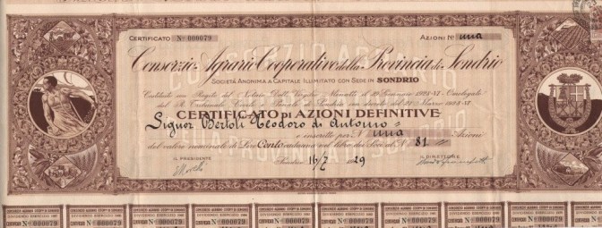 A-29720CONSORZIO AGRARIO COOPERATIVO DELLA PROVINCIA DI SONDRIO-1Sondrio19291 azione di fondazione nominativa da Lire 100R2 (1001-5000 pezzi)S3 (da 51 a 100 €)