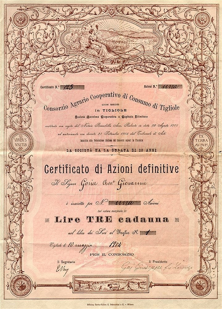 Superbo fronte con ampia cornice riccamente fregiata. Vignetta allegorica in alto con dea dell’Agricoltura, seduta vicino ad attrezzi agricoli, che innalza un grappolo d’uva ammirando il sole nascente. In basso aratura con i buoi. Ai lati spiccano medaglioni con i motti latini “Viribus Unitis – Ex Terra Aurum”.