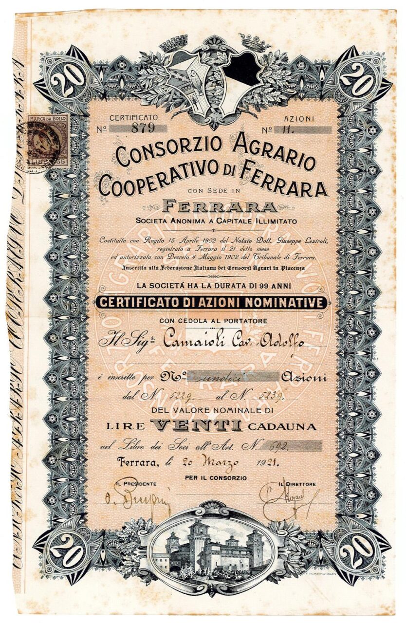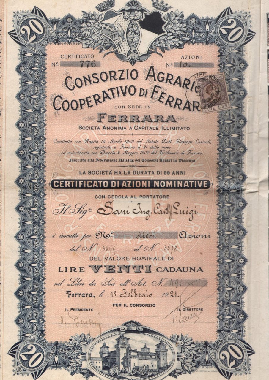 Nell’ultimo ventennio dell’Ottocento si andò affermando l’associazionismo dei possidenti ferraresi con la creazione dei consorzi agrari, riunitisi nel 1892 nella Federazione Italiana dei Consorzi Agrari o Federconsorzi di Piacenza. Lo scopo iniziale era la difesa degli interessi padronali contro la massa dei lavoratori. Il Consorzio Agrario Cooperativo di Ferrara, creato nel 1902, cambiò denominazione nel 1929 in Consorzio Agrario di Ferrara: il termine “cooperativo”, che evocava ideali socialisti, fu di fatto epurato. Successivamente si trasformò in Consorzio Agrario Provinciale per la Provincia di Ferrara.