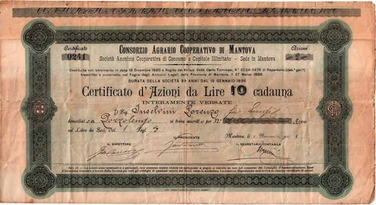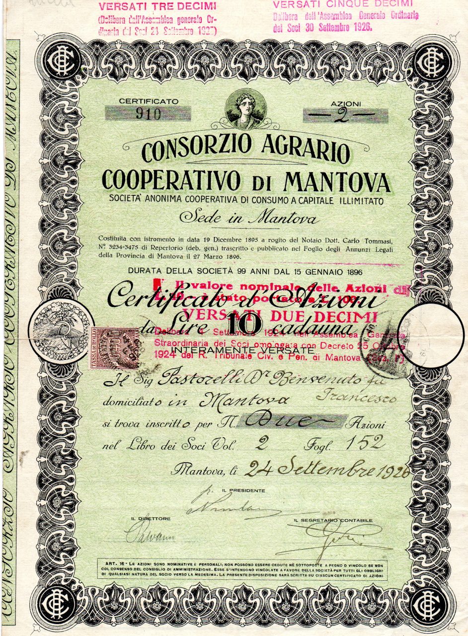 C-40195Consorzio Agrario Cooperativo di Mantova-3Mantova19262 Azioni da Lire 10R3 (501-1000 pezzi)S3 (da 51 a 100 €)