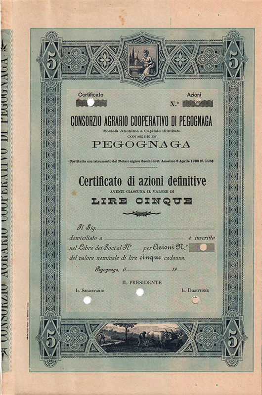 Bei ricami nel bordo che accoglie in alto lo stemma civico di Pegognaga – con il dio Po e la dedica latina Pado Patri ovvero al Padre Po, a testimonianza della devozione fluviale della sua prima comunità – e in basso l’aratura del terreno con i buoi. Il consorzio, costituito nel 1900, rappresentò un classico esempio di cooperazione agro-alimentare in Emilia-Romagna all’inizio del XX secolo.
