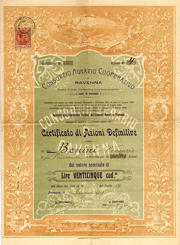 Bellissimo fronte con cornice riccamente fregiata. Vignetta allegorica in alto con dea dell’Agricoltura, attrezzi agricoli e sole nascente. In basso aratura con i buoi. Stemmi araldici ai lati, agli angoli inferiori spiccano i motti latini Viribus Unitis – Ex Terra Aurum.