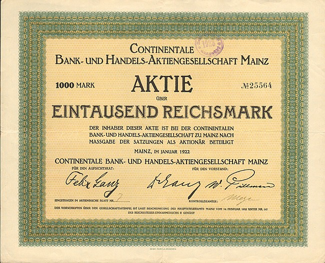 A-56972Continentale Bank – und Handels – Aktiengesellschaft Mainz-1Mainz19221 azione al portatore di 1.000 RM--