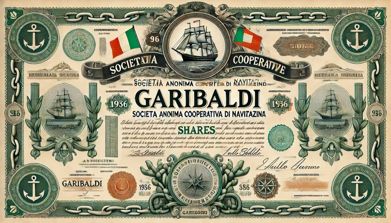 Immagine rappresentativa ispirata al certificato di azioni del 1936 della “Garibaldi” Società Anonima Cooperativa di Navigazione. L’immagine include simboli marittimi, bordi decorativi verdi e una tipografia elegante.