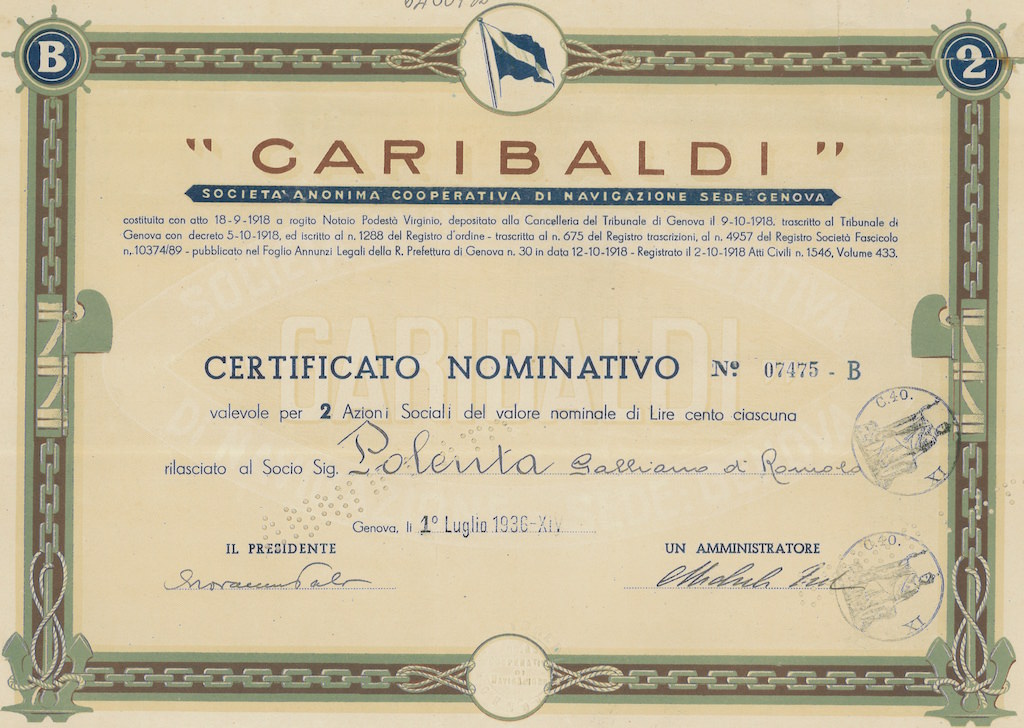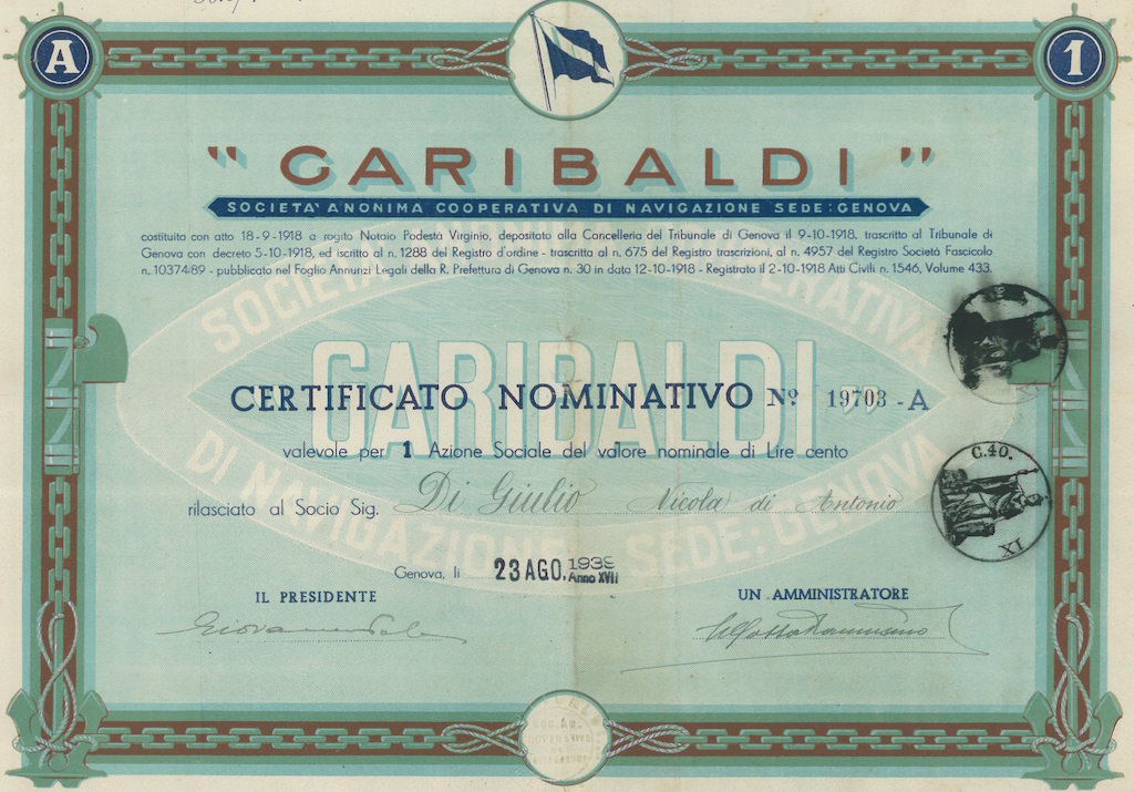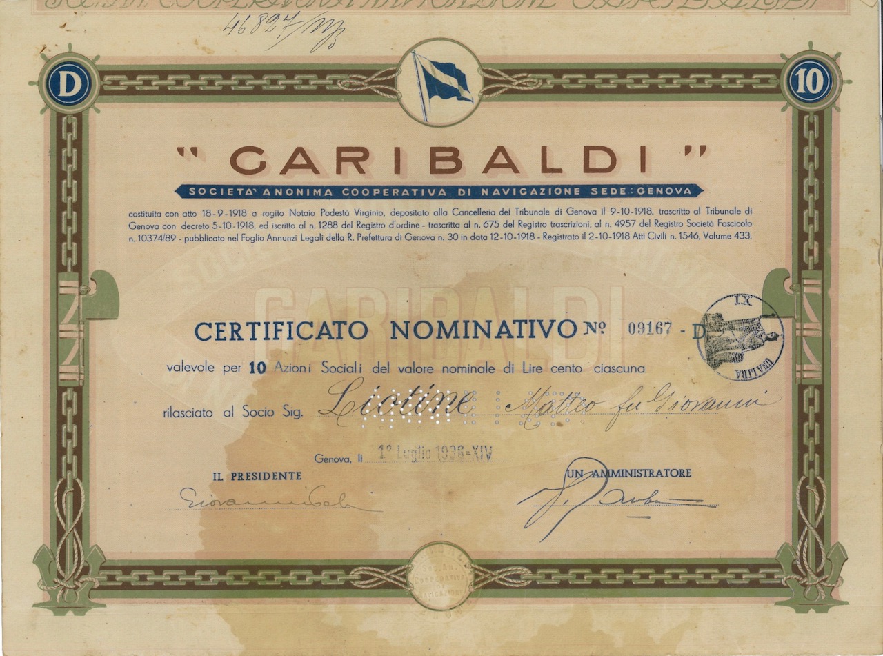 Descrizione dei Documenti: Azioni sociali emesse dalla “Garibaldi” Società Anonima Cooperativa di Navigazione, con sede a Genova. La società è stata costituita il 18 settembre 1918 e ufficialmente registrata il 12 ottobre 1918. Il certificato è rilasciato a un socio e rappresenta un valore nominale di 100 lire per azione.