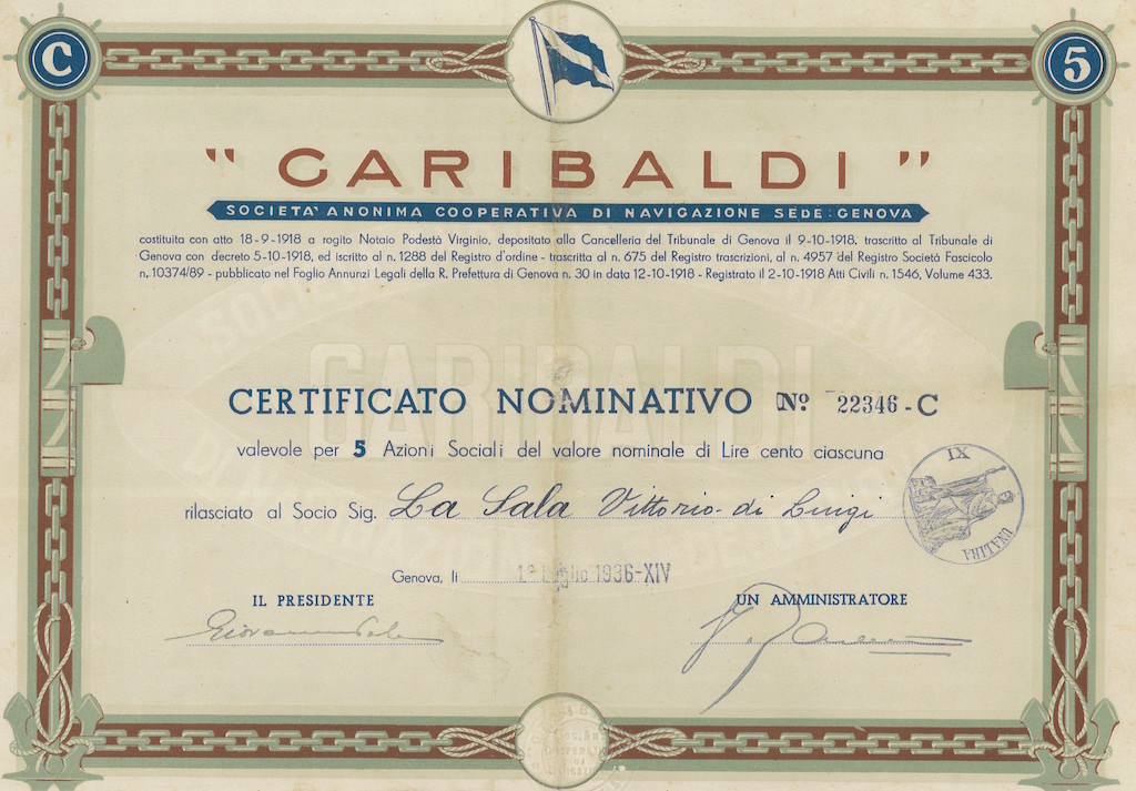 Immagine rappresentativa ispirata al certificato di azioni del 1936 della “Garibaldi” Società Anonima Cooperativa di Navigazione. L’immagine include simboli marittimi, bordi decorativi verdi e una tipografia elegante.