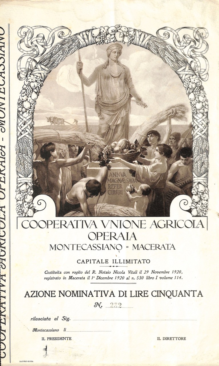 A-7238Coop. Unione Agricola Operaia Montecassiano – Macerata-1Danesi – RomaMacerata19201 azione nominativa da Lire 50R4 (251-500 pezzi)S4 (da 101 a 250 €)