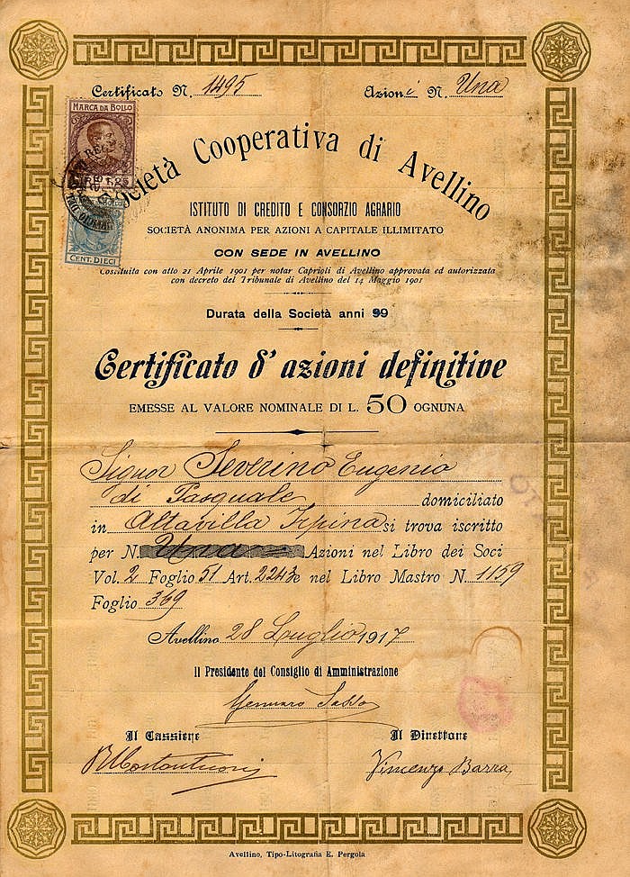 C-41322Cooperativa di Avellino – Istituto di Credito e Consorzio Agrario Soc.-3Avellino19171 azione nominativa cumulativa da Lire 50R2 (1001-5000 pezzi)S3 (da 51 a 100 €)