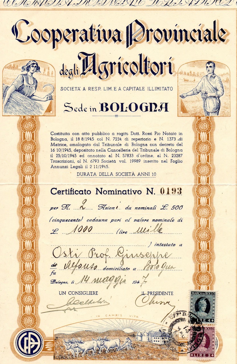 A-27055Cooperativa Provinciale degli Agricoltori-1N.D.Bologna1947VariabileR5 (101-250 pezzi)S4 (da 101 a 250 €)