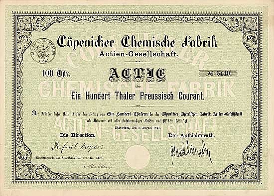 Una fioritura tipica dei cosiddetti anni della fondazione, di cui Glagau scrive: “Fondata da Eduard Mamroth e Leo Wollenberg a Berlino e Michaelis a Posen. Per il 1871 ci fu un dividendo artificiale del 10%, nel 1872 del 6% per una fortunata speculazione sullo zolfo, nel 1873 solo l’1%, poi lo 0%. La fabbrica chimica si rivolse alla stampa di carta da parati, al fabbro, al rame e alla fabbricazione di cestini. L’anno 1875 si concluse con una perdita di quasi 90.000 talleri. Lo stesso doveva essere molto più grande, tuttavia, perché le azioni una volta pagate a 120 erano ancora quotate intorno a 1 e furono sospese, dopodiché la liquidazione ebbe luogo negli anni 1877-1880 “. Il sito della fabbrica su Wendenschloßstraße su entrambi i lati di un canale di derivazione della Sprea fu mantenuto per l’industria chimica, poiché poco dopo si trovava qui la fabbrica di nitriti (trasformata in AG nel 1906), che con circa 200 lavoratori produceva acido formico, tannino, acido gallico e pirogallico, perborato, perossido di idrogeno, borace, sali di bromo e preparati organici per scopi farmaceutici e fotografici. I principali azionisti erano la famiglia von Gwinner (Arthur von Gwinner fu CEO di Deutsche Bank fino alla sua morte nel 1919). Nel 1945 la fabbrica di Köpenick fu completamente smantellata dai russi e dichiarata VEB.