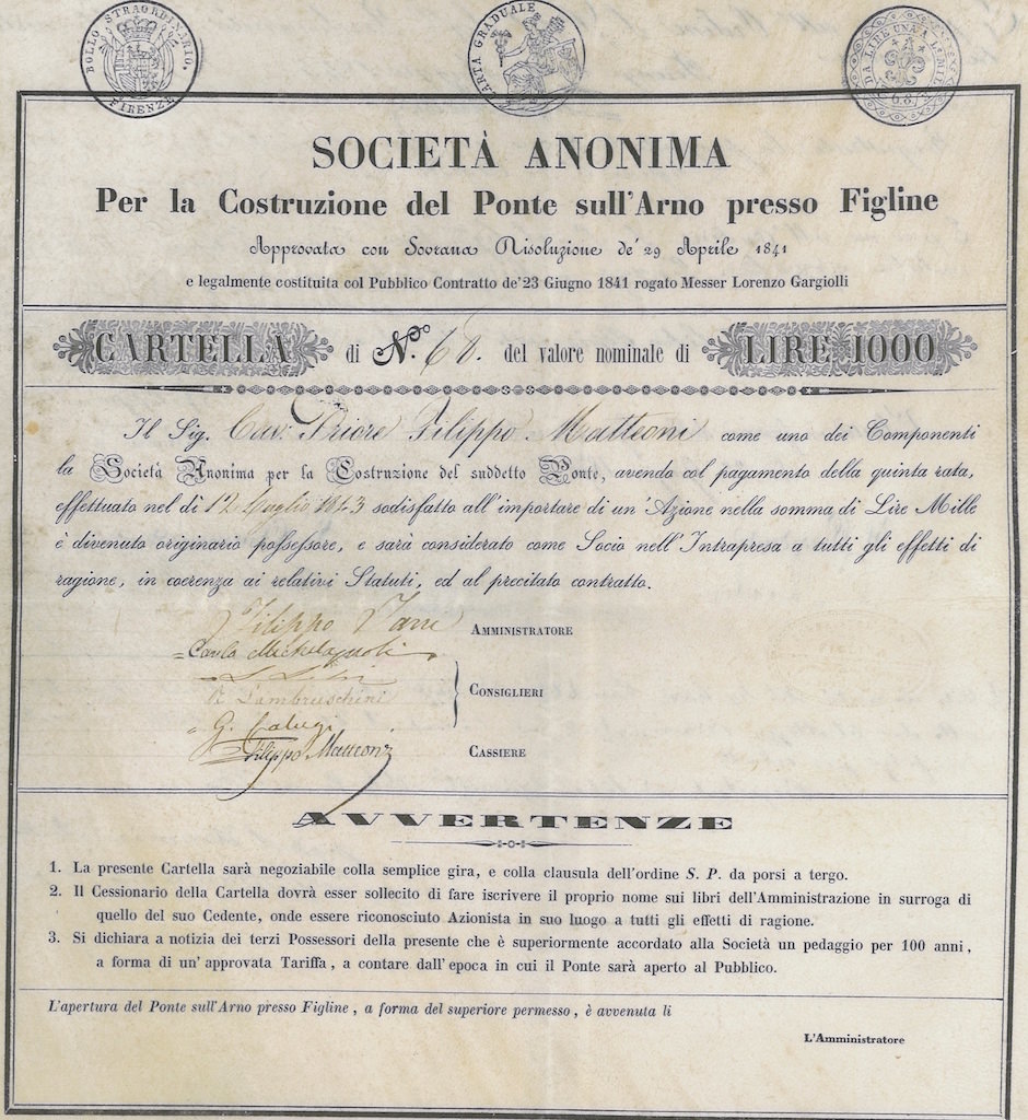 B-944Costruzione del Ponte sull’Arno presso Figline S.A. per la-2-Firenze1843Cartella da lire 1000R5 (101-250 pezzi)S5 (da 251 a 500 €)