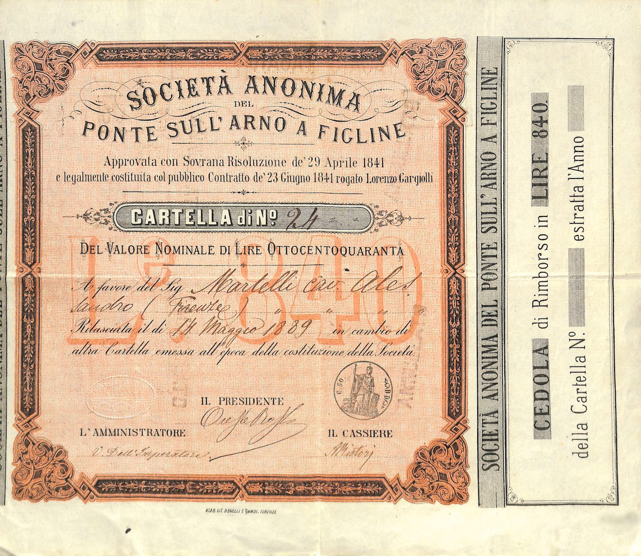 D-944Costruzione del Ponte sull’Arno presso Figline S.A. per la-4Stab. A. Gambi - FirenzeFirenze1889Cartella di lire 840R4 (251-500 pezzi)S4 (da 101 a 250 €)