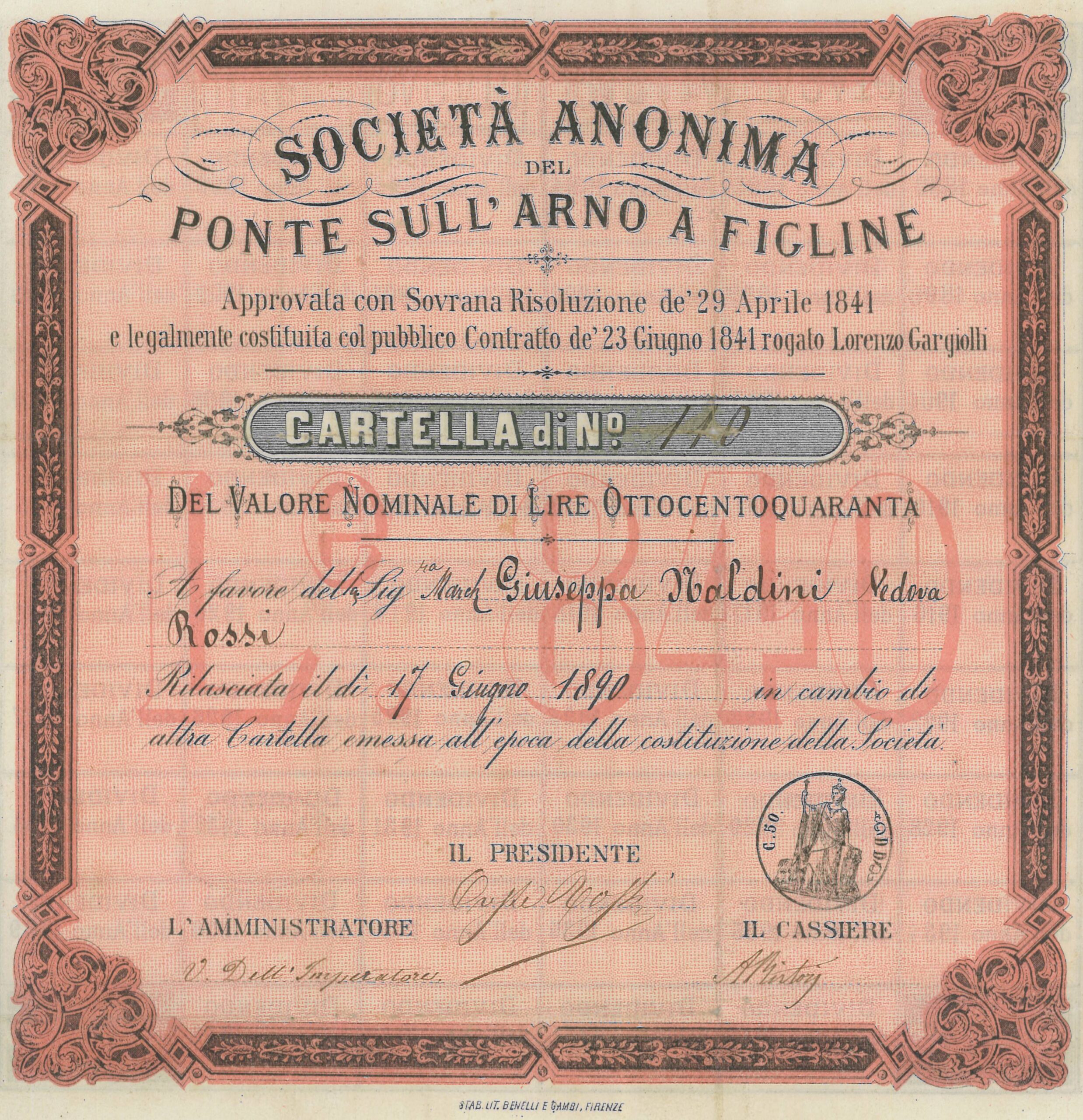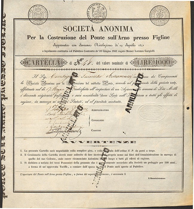 A-944Costruzione del Ponte sull’Arno presso Figline S.A. per la-1N.D.Firenze1841Cartella da lire 1000R5 (101-250 pezzi)S5 (da 251 a 500 €)