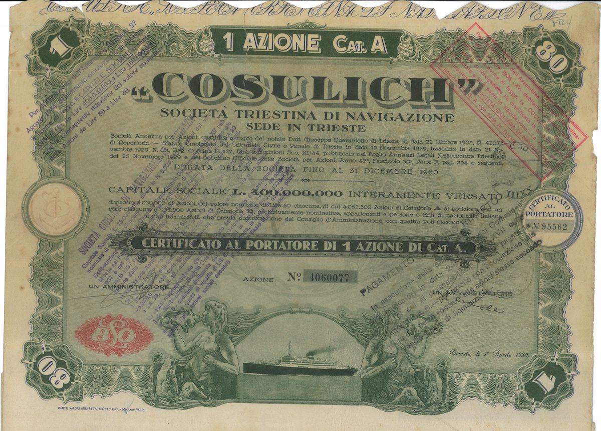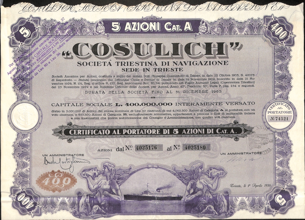 G-4172Cosulich-7N.D.Trieste19305 azioni da Lire 80R3 (501-1000 pezzi)S4 (da 101 a 250 €)