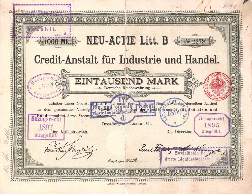 Fondata a Dessau nel 1856. “Il giorno dell’abbonamento azionario, il 18 marzo 1856, c’era una folla pericolosa per la vita nel municipio.” È stata accolta l’idea imprenditoriale, “di costituire società industriali o di altro tipo, di trasformare società o stabilimenti in società per azioni, e di emettere azioni e obbligazioni per tutte le società”. Tuttavia, il capitale azionario mirato di 8 milioni non è mai stato raggiunto, ma solo 6 milioni: i fondi della banca hanno dato un contributo significativo alla promozione dello sviluppo industriale della regione. Ma erano tutte aziende giovani che avevano bisogno del capitale e del tempo per generare i profitti corrispondenti. Sopportare questo incantesimo secco è stato difficile per l’ente creditizio. Non vi fu alcun dividendo e nel 1862 il governo, sotto la sua supervisione, ebbe l’idea di liquidarlo. Ma i lunghi anni di perdita furono superati e nel 1873 fu distribuito un dividendo del 12%. Un anno dopo, il quartier generale fu trasferito a Dresda per essere più vicini al “fattore essenziale della nostra attività attuale”, le miniere di carbone marrone in Boemia. Il Creditanstalt, che è quotato a Berlino e Dresda, possedeva le società bancarie Horn & Dinger e George Meusel & Co. come partecipazioni a Dresda. A causa di prestiti sovradimensionati al gruppo Kummer, è crollato poco dopo il 1900.