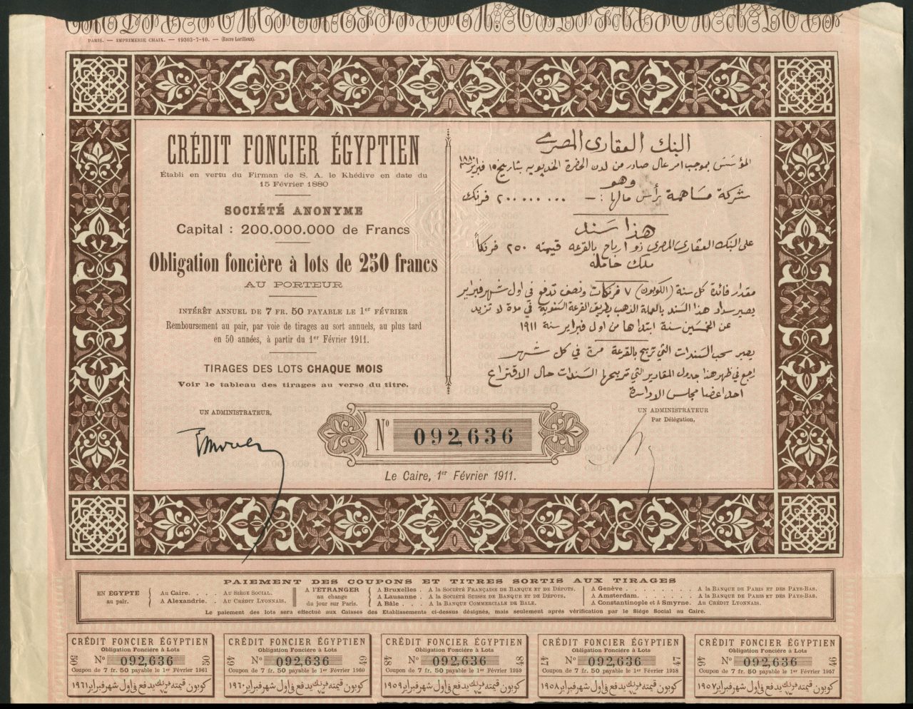 Formata da Khedival Firman il 15 febbraio 1890. Capitale 200.000.000 di franchi.